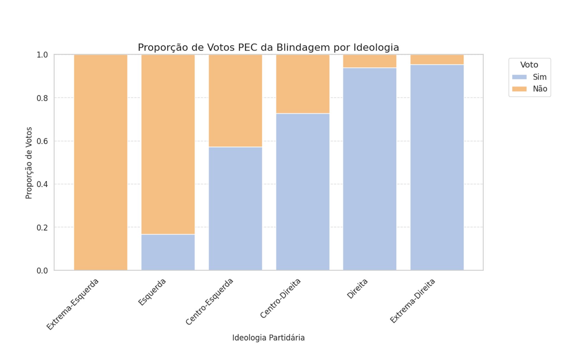 Os resultados indicam que há, sim, uma associação entre os votos e a posição ideológica dos partidos. Quanto mais à direita, maior a proporção de votos para a PEC da Blindagem. No campo da extrema-direita, a proporção de votos favoráveis foi de 100%, uma distribuição exatamente inversa entre os partidos de extrema-esquerda, com 100% dos votos contra a medida.