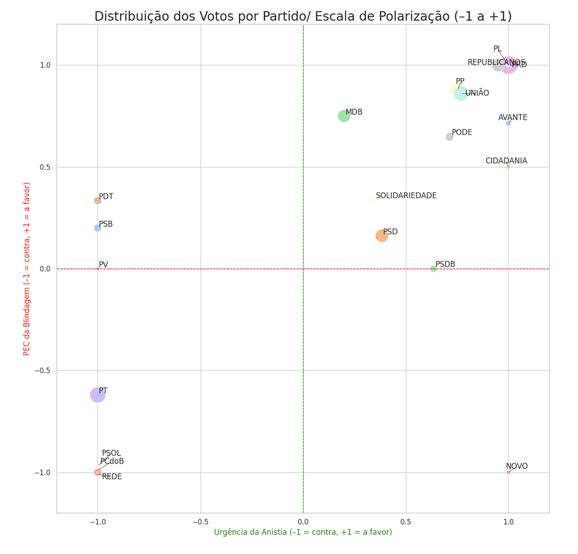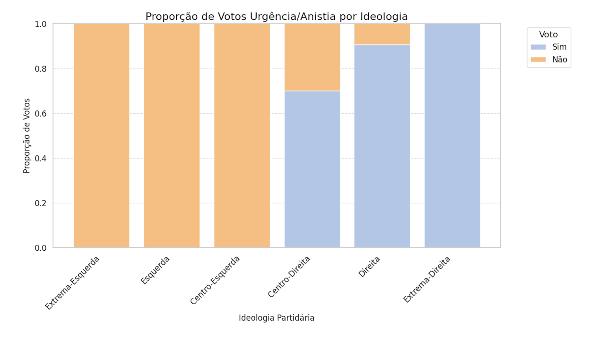 A separação ideológica esquerda-direita organiza melhor os partidos na votação da anistia. PDT, PSB, PV, PT, PSOL, Rede e PCdoB, todos partidos do campo da esquerda, estão localizados no lado esquerdo do gráfico, em oposição ao regime de urgência da anistia. No lado direito, estão partidos do campo da direita e centro-direita, com votos amplamente a favor da anistia.
