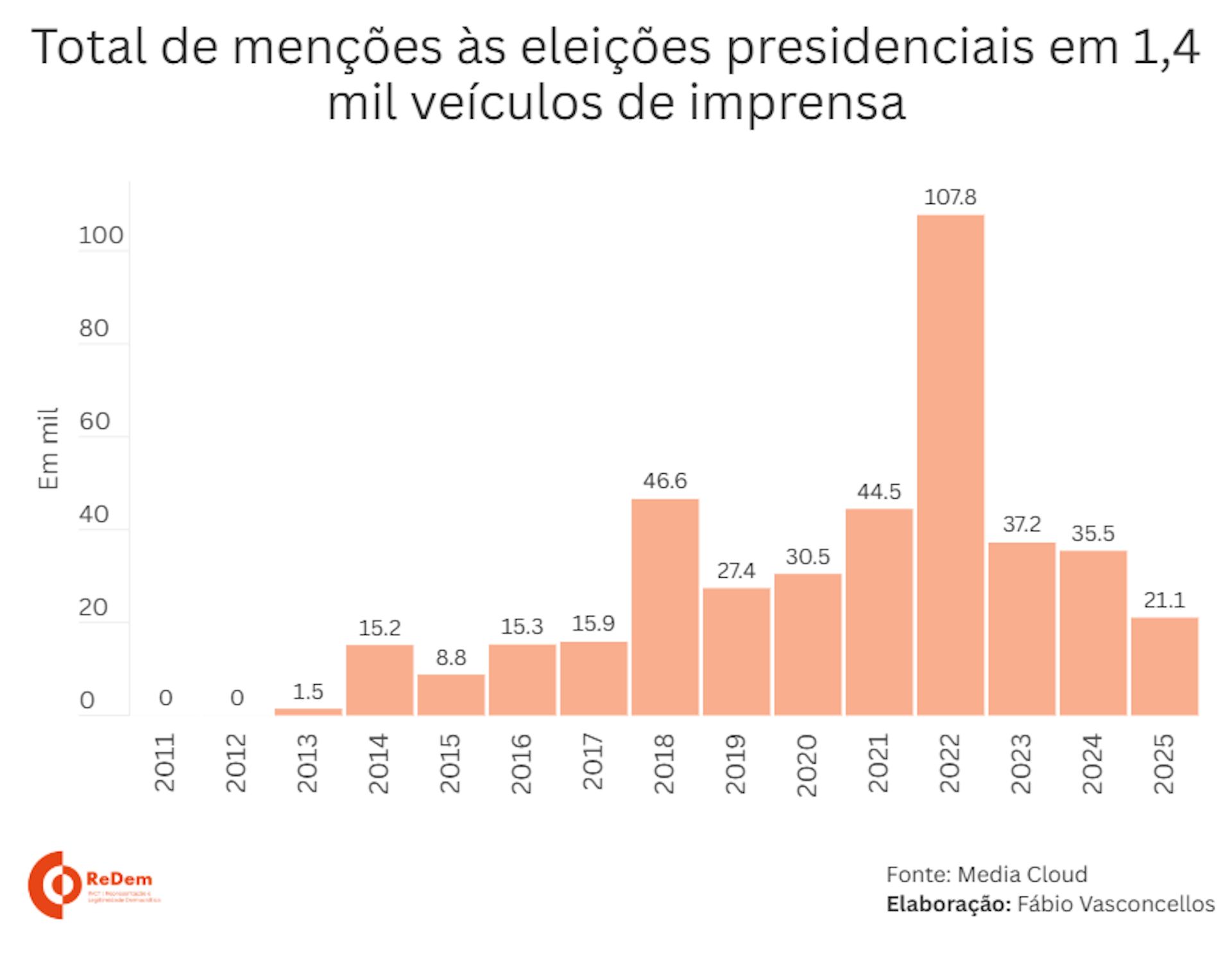 O mapeamento identificou mais de 407 mil menções às eleições presidenciais entre 2011 e 2025 (até o início de outubro), das quais 26% estão concentradas em 2022. Como esperado, anos eleitorais tendem a inflacionar os dados, já que a imprensa se empenha em cobrir a agenda dos pré-candidatos, a campanha, as pesquisas e o dia da eleição.