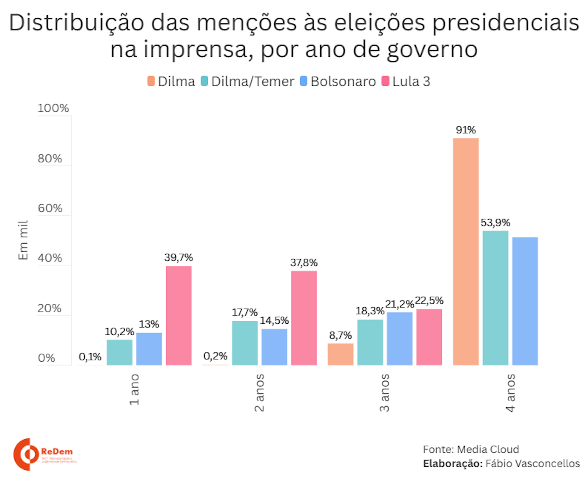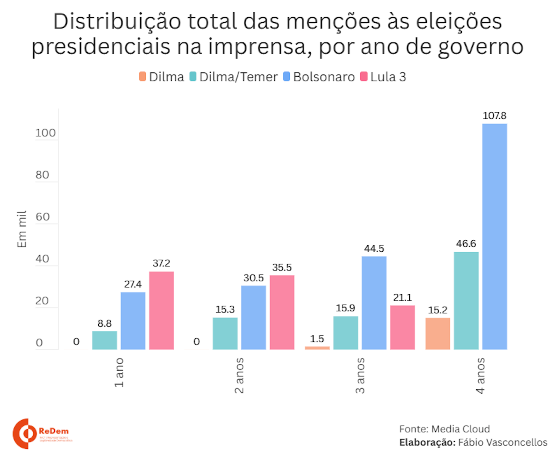 Essa análise confirma a primeira conclusão: o 4º ano de mandato registra a maior proporção de menções em razão da intensificação da cobertura eleitoral pela imprensa no comparativo entre os mandatos de Dilma, Dilma/Temer e Bolsonaro. É possível que essa distribuição se repita em 2026.