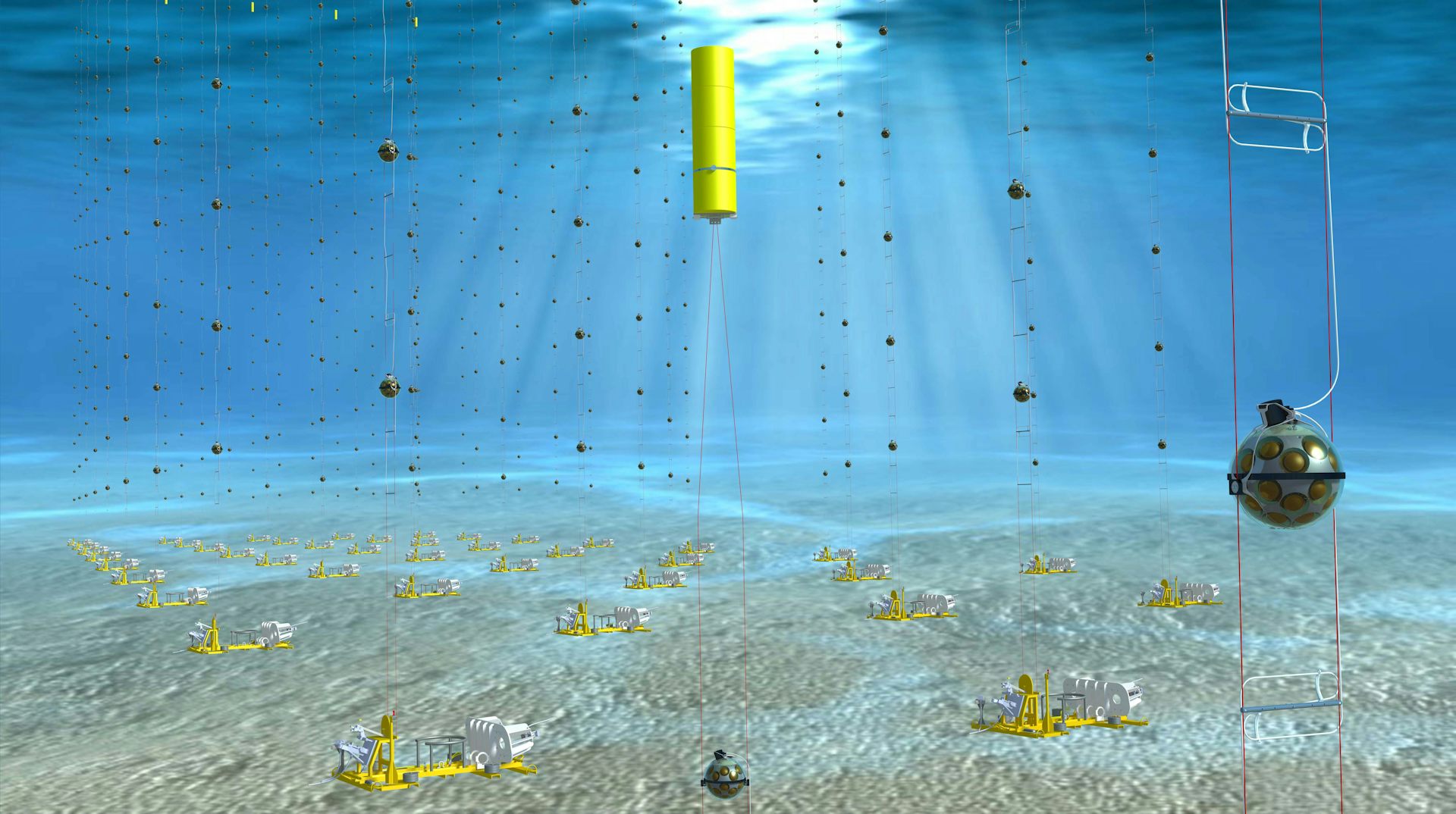 As estações de detecção consistem em quase 600 detectores de luz – boias esféricas, cada uma contendo 31 tubos sensores de luz, que são presos a cabos ancorados no fundo do mar a até 3,5 km abaixo da superfície.