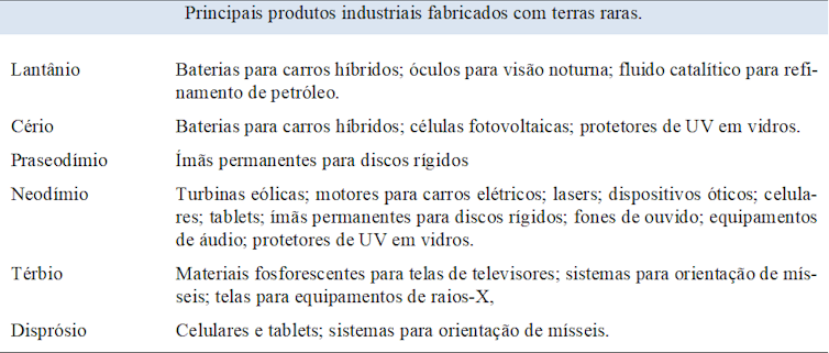 Vejamos então o caso das terras raras, cujas reservas naturais no Brasil são inferiores apenas às da China. Na tabela abaixo estão os principais produtos industriais manufaturados com esses elementos. Quando se observa a presença desses produtos em nosso cotidiano, não há necessidade de qualquer comentário para entender o interesse expresso pelo encarregado de negócios da Embaixada dos EUA.