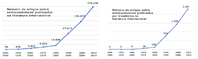 É interessante observar que na área de semicondutores as publicações brasileiras seguem o padrão internacional. Ou seja, o crescimento na quantidade de artigos publicados sobre o assunto começou nos anos 1960, com um ponto de inflexão em 1980, tanto na literatura internacional quanto na literatura nacional. Neste caso, a diferença reside apenas na quantidade, o que é normal.