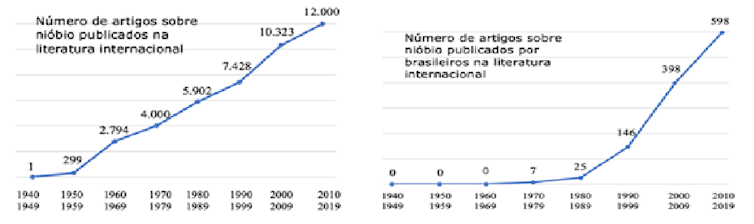 Comecemos com o nióbio, com cerca de 90% das reservas globais conhecidas no Brasil. Levantamento no banco de dados de estudos científicos Web of Science (WoS) mostra que o número de artigos na literatura internacional a respeito do nióbio cresceu linearmente a partir de 1950. Levando em conta apenas artigos com a participação de cientistas brasileiros, o crescimento linear só começa a partir de 1980, mas com uma alta mais acentuada desde então.