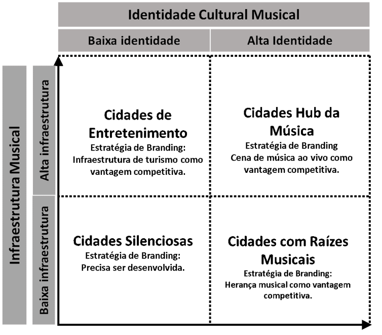 Para compreender melhor como diferentes cidades se posicionam entre esses dois eixos, propomos a matriz Infraestrutura Musical x Identidade Cultural Musical (Figura1). Essa ferramenta nos permite visualizar quatro perfis distintos de cidades musicais: