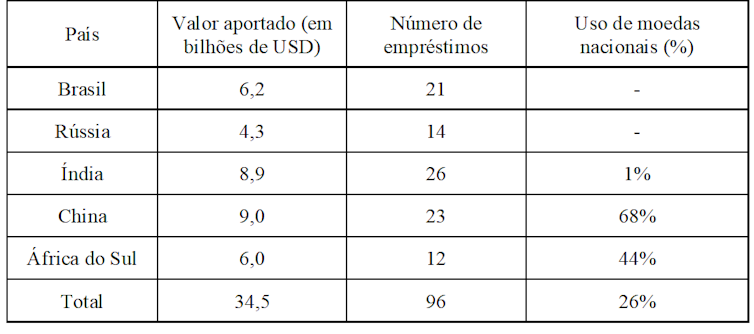 Para cumprir atingir seus alvos estratégicos, o NDB tem dado prioridade à expansão dos financiamentos realizados nas moedas locais de seus países-membros. Essa tática busca reduzir a exposição dos clientes às flutuações cambiais e facilitar o acesso do setor privado a recursos para financiar projetos. No entanto, até agora nenhum dos aportes ao Brasil e Rússia foram realizados em real e rublo, respectivamente.
