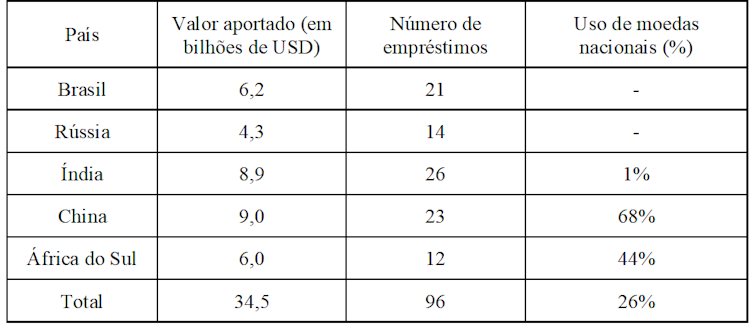 Para cumprir atingir seus alvos estratégicos, o NDB tem dado prioridade à expansão dos financiamentos realizados nas moedas locais de seus países-membros. Essa tática busca reduzir a exposição dos clientes às flutuações cambiais e facilitar o acesso do setor privado a recursos para financiar projetos. No entanto, até agora nenhum dos aportes ao Brasil e Rússia foram realizados em real e rublo, respectivamente.