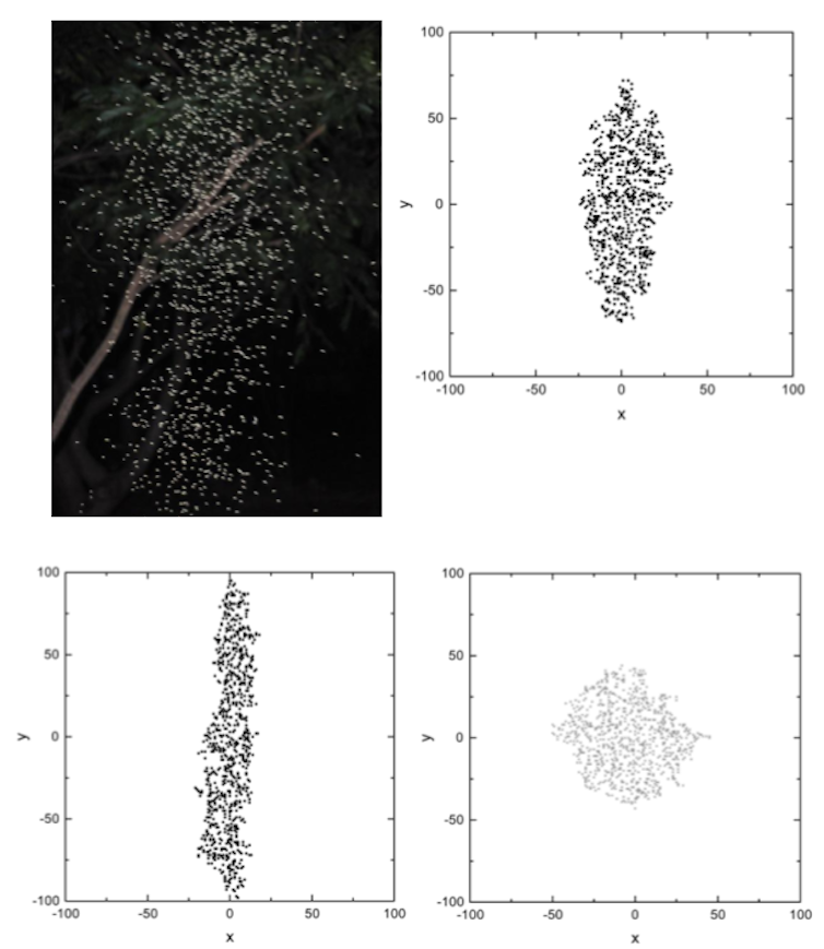 Outros modelos assumem que os mosquitos são atraídos por um ponto central, como se estivessem ligados a uma mola invisível. Mas essa perspectiva talvez possa ser melhor relacionada aos casos das nuvens de insetos formadas em volta de lâmpadas, que não se aplicam ao fenômeno de aglomeração natural e que analisaremos aqui.