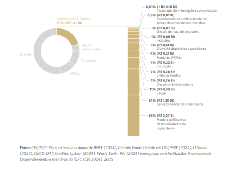 Levantamento da Climate Policy Initiative (CPI), sobre o mapeamento do financiamento climático internacional ao Brasil (2021–2022) indica que apenas 4% do total destinado à categoria “Intersetoriais e Outros” foi direcionado especificamente para apoio a micro, pequenas e médias empresas (MPMEs).