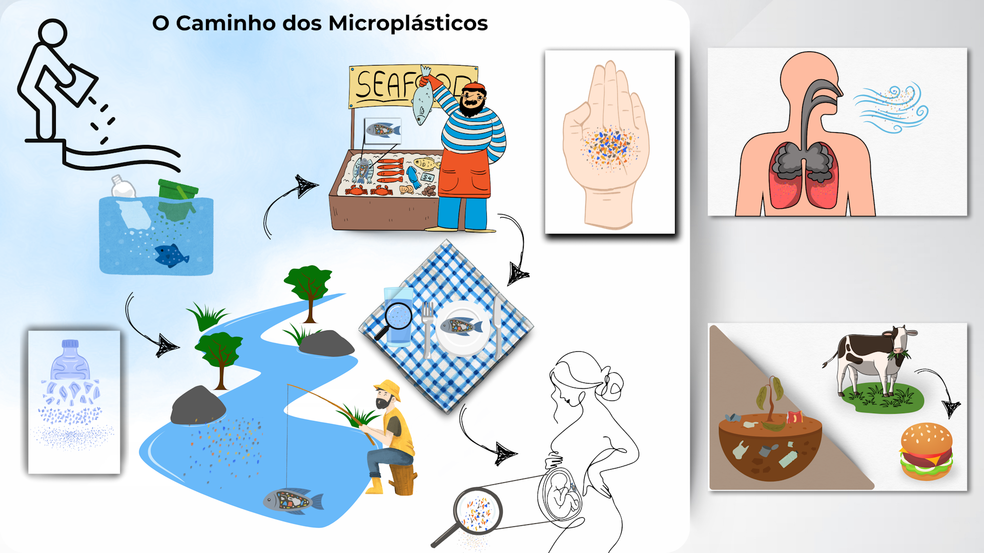 Para entender a disseminação dessas partículas, vale lembrar o ciclo da água: evaporação, condensação, precipitação, infiltração e escoamento. A água circula entre a atmosfera, o solo, rios e mares — e os microplásticos vão junto. Por isso, eles são encontrados em ambientes aquáticos, terrestres, atmosféricos e até no interior de organismos vivos, conforme ilustrado abaixo.