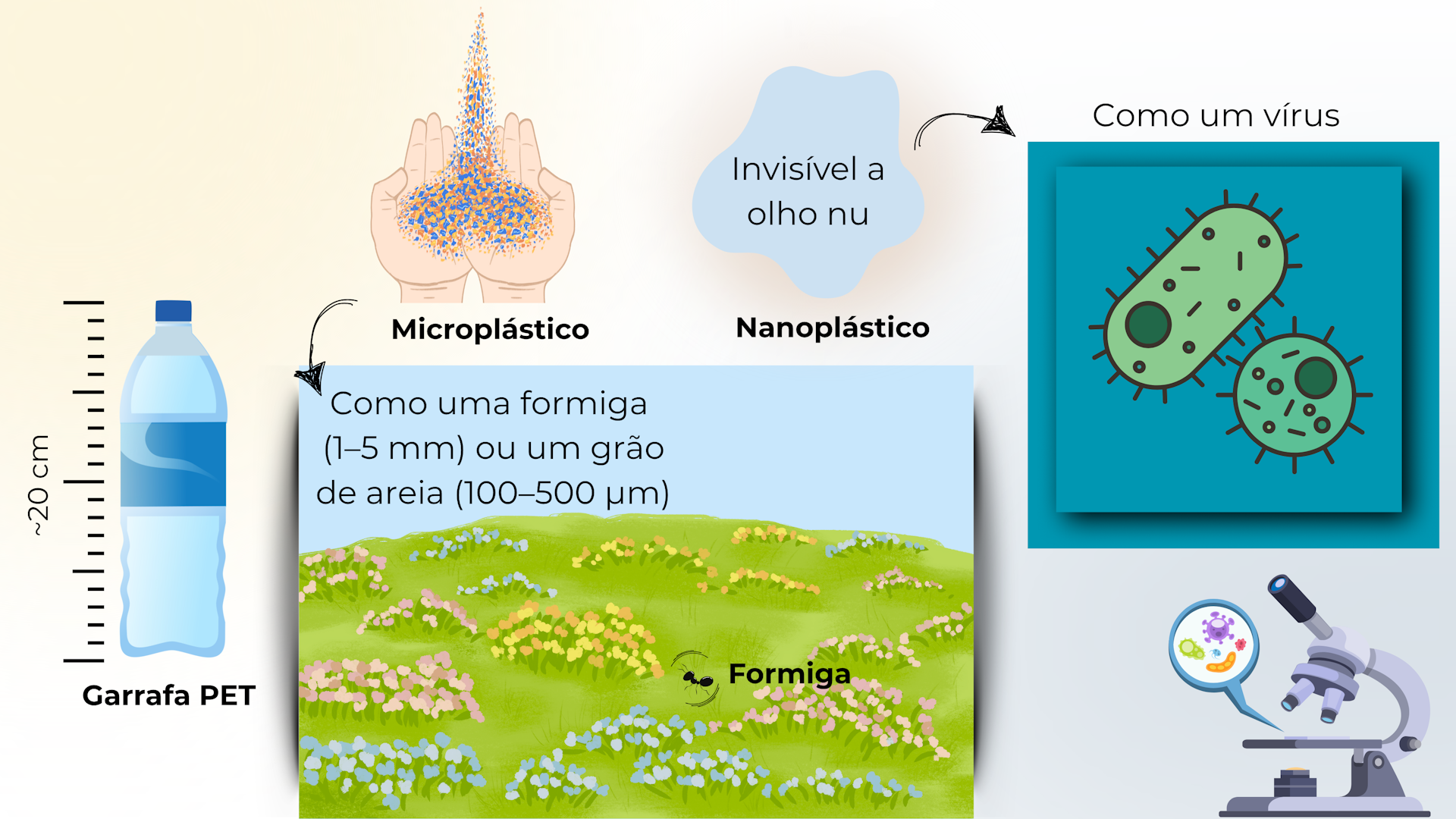 Para comparar, areia grossa tem tamanho similar ao dos microplásticos. Já os nanoplásticos são menores que a espessura de um fio de cabelo (50–100 µm). Visualmente, uma formiga poderia representar um microplástico diante de uma garrafa PET (polietileno tereftalato), enquanto um vírus ilustraria um nanoplástico, conforme ilustrado na figura abaixo.