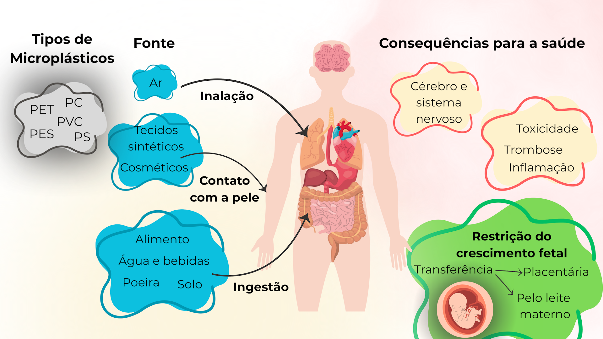 A figura abaixo resume as diferentes vias pelas quais os microplásticos podem entrar no corpo humano, bem como os modos de interação e as potenciais consequências para a saúde associadas.