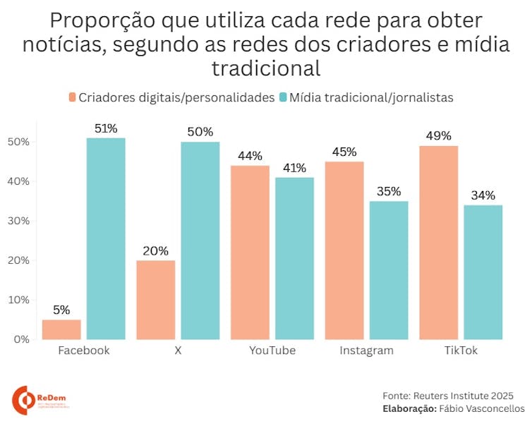 A clivagem geracional é amplificada pela arquitetura das plataformas: enquanto o Facebook e o X (antigo Twitter) ainda sustentam parte da atenção jornalística, o TikTok, Instagram e YouTube são territórios dominados por criadores — especialmente aqueles voltados ao comentário político e à explicação de notícias complexas.