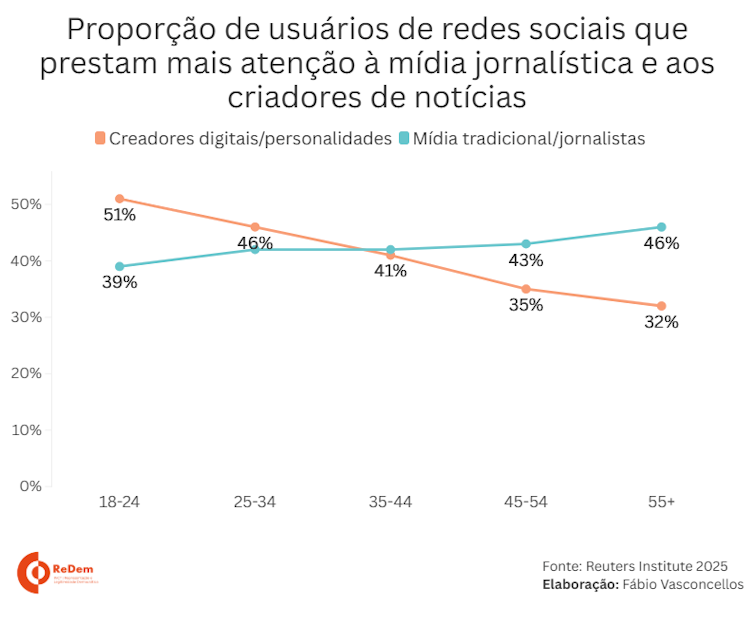 Em nível global, os usuários com menos de 35 anos, 48% consomem notícias por meio de criadores, superando os 41% que recorrem à mídia tradicional. O padrão se inverte entre os mais velhos, com 44% ainda preferindo veículos jornalísticos.