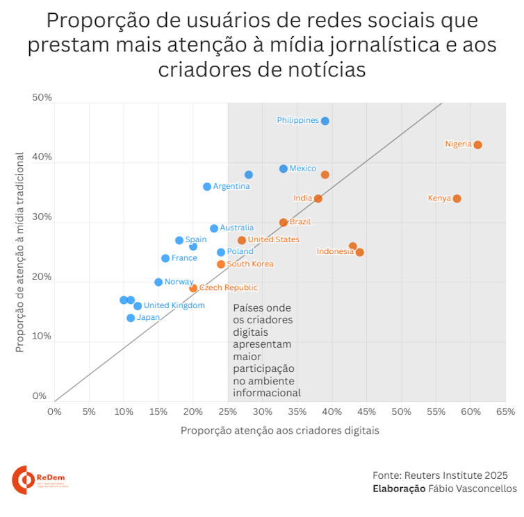 A análise de 24 países feita pela Reuters mostra que o impacto dos criadores de conteúdo varia significativamente por região, idade e tipo de plataforma. Em países do Norte da Europa e no Japão, a mídia tradicional ainda mantém hegemonia nas redes sociais. Já em mercados de alto impacto — como o Brasil — os influenciadores dominam o fluxo informativo.