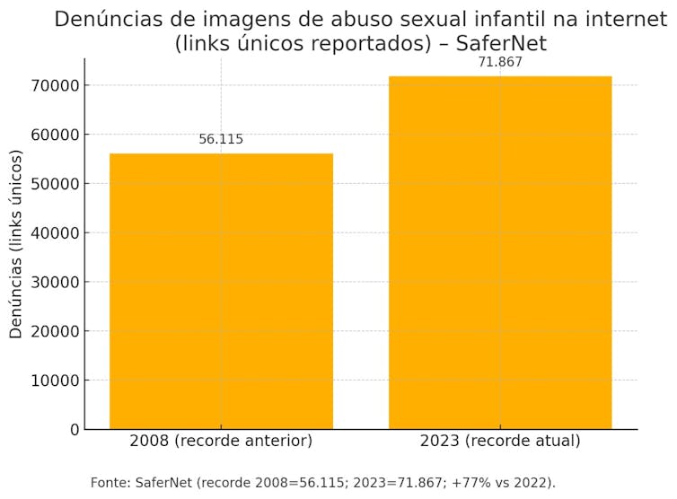 O Brasil reúne números que exigem ações urgentes. Em 2023, batemos um triste recorde: a organização SaferNet recebeu 71.867 denúncias de imagens de abuso sexual infantil online, um aumento alarmante de 77% em relação ao ano anterior (Figura 1). Esses números revelam uma grave vulnerabilidade associada à alta exposição das crianças à internet sem supervisão adequada.