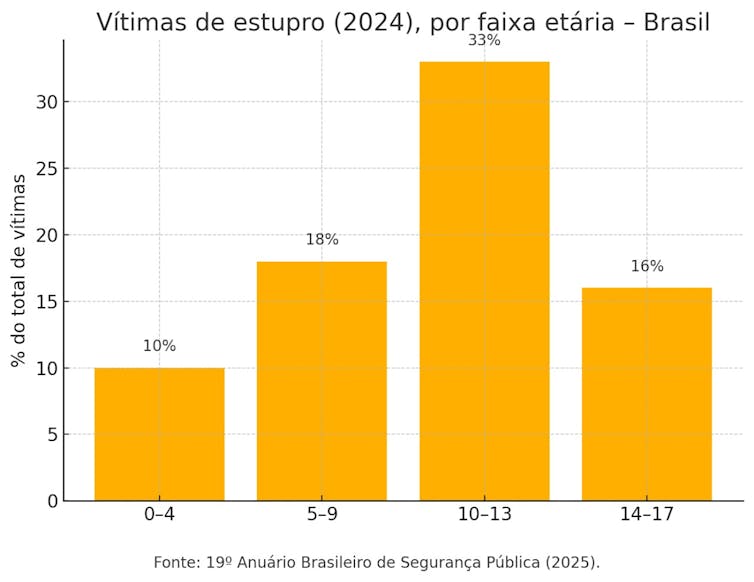 A violência sexual, contudo, não está restrita ao meio digital. Em 2024, o 19º Anuário Brasileiro de Segurança Pública registrou 87.545 casos de estupro e estupro de vulnerável; desse total, 61,3% das vítimas tinham até 13 anos (Figura 2). Esses dados também estão relacionados à vulnerabilidade ampliada pelas plataformas digitais, que frequentemente são utilizadas como canal inicial para o aliciamento, manipulação psicológica e exposição a conteúdos que incentivam ou normalizam abusos.