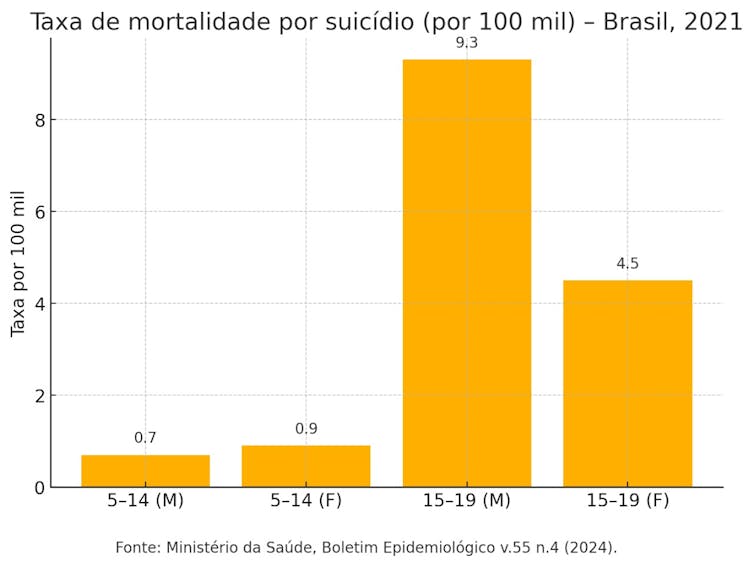 Além disso, o impacto negativo do ambiente digital pouco regulado também aparece em indicadores críticos de saúde mental. Em 2021, o suicídio foi a 3ª causa de morte entre adolescentes brasileiros (15 a 19 anos), com taxas alarmantes de 9,3 por 100 mil entre meninos e 4,5 entre meninas (Figura 3).