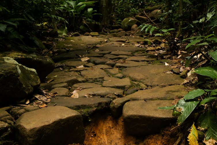 Uma das evidências mais claras são as trilhas e caminhos antigos utilizados para escoar os diversos produtos do maciço, como lenha, carvão e café. Alguns desses caminhos possuem ainda trechos calçados de pedra, como nas famosas trilhas da Pedra da Gávea, Pedra Bonita e Transcarioca.