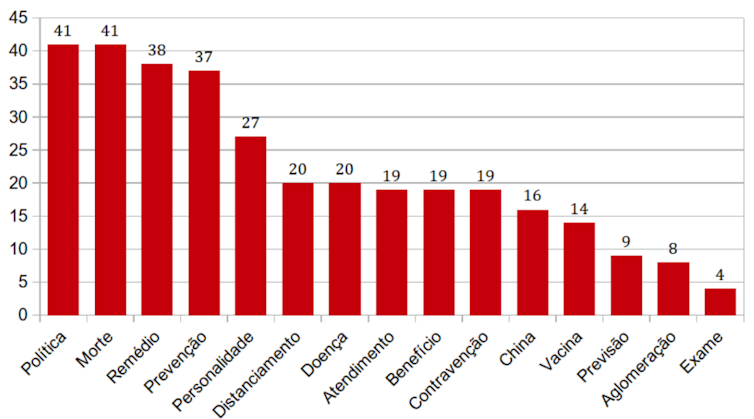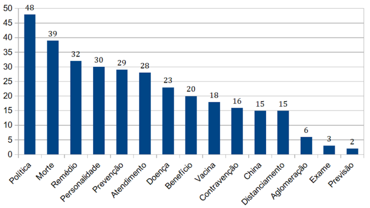 Esta conjuntura mundial, não apenas brasileira, conduz novamente ao resultado de que, na análise das duas agências nacionais, houve uma coincidência expressiva entre os assuntos mais checados: Política e Morte, sendo as duas principais, seguidas por Remédio e Prevenção. Nesse sentido, observamos que a alta frequência de Política revela a polarização ideológica que se vive no Brasil e no mundo, resvalando até numa crise sanitária global como a pandemia do novo coronavírus. Não é coincidência que uma das figuras recorrentes nas fake news tenha sido João Doria, então governador de São Paulo que apoiou o presidente Jair Bolsonaro na eleição e, naquele momento, havia se tornado um opositor.