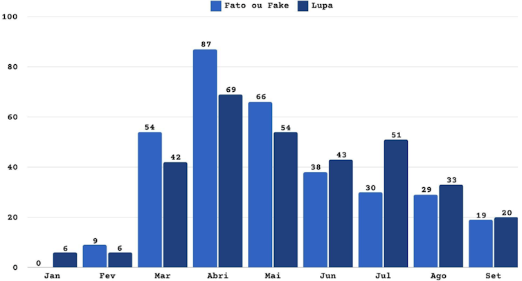 Número de publicações sobre Covid nas duas principais agências de checagem entre janeiro e setembro de 2020:
