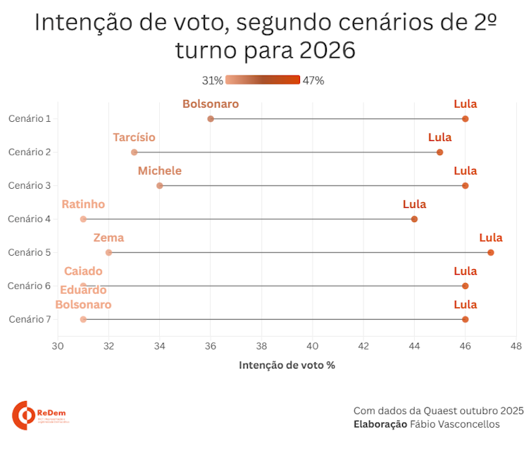 Nessa perspectiva, é possível especular algumas consequências da condenação e prisão de Bolsonaro para o cenário 2026. Mesmo declarado inelegível pelo Tribunal Superior Eleitoral (TSE) desde 2023, o ex-presidente é quem melhor pontua hoje entre os candidatos do campo da direita. Na rodada da pesquisa Quaest divulgada este mês, Bolsonaro registrou 39% contra 42% de Lula em possível segundo turno. Entre todos os candidatos da direita, o ex-capitão é o mais competitivo na disputa com o atual presidente da República.