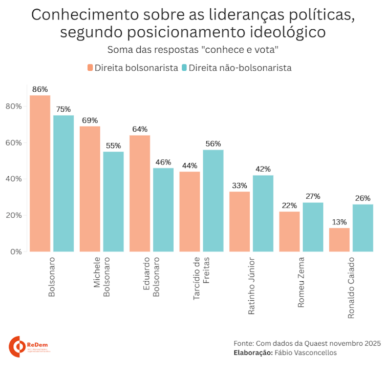 Bolsonaro, sua esposa Michele Bolsonaro e o filho Eduardo registravam os maiores percentuais de conhecimento entre os eleitores do campo da direita. Os possíveis candidatos desse espectro político, como Tarcísio de Freitas, Ratinho Júnior, Romeu Zema e Ronaldo Caiado apresentam percentuais menores. Chama atenção que os números foram sempre mais baixos entre os eleitores bolsonaristas, e maiores entre os não-bolsonaristas. Identificação política e atenção parecem, nesse caso, caminhar juntas.
