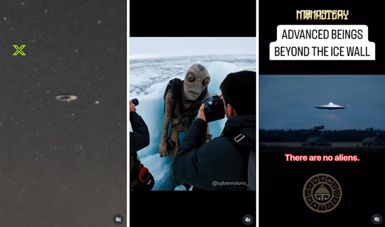 Vídeos de naves alienígenas gerados por IA se tornaram rotina em grupos conspiracionistas, inclusive rendendo matérias de checagem de fatos ao redor do mundo com esse alerta. A estética varia. Há aqueles com discos voadores sobrevoando áreas urbanas, filmados “acidentalmente” por celulares, e outros que mostram luzes piscantes no céu, com movimentos erráticos e sons graves e distorcidos. Em alguns, naves pousam em campos desertos, sempre com uma suposta “testemunha” tremendo a câmera no melhor estilo found footage. Alguns vídeos inclusive mostram supostos alienígenas de perto. E os comentários juram que “dessa vez é real”.