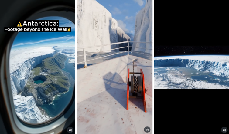 Adepto de conspiracionistas da terra plana, a ideia de uma “muralha de gelo” circulando o planeta terra já vem sendo desmentida há anos. Com IA em mãos, porém, as muralhas de gelo se tornaram mais sofisticados visualmente. Eles simulam sobrevoos por uma vasta faixa polar até que surgem enormes paredões congelados, supostamente o limite da Antártida e da própria Terra. Em algumas versões, humanos caminhando são inseridos para mostrar “proporção real”. Em outras, vê-se uma entrada secreta, com cavernas brilhando e paisagens inexploradas logo além do gelo. Há vídeos que mostram ouro, pirâmides e civilizações escondidas do outro lado. A IA entrega o que a imaginação pedir. E a ilusão, nesse caso, é servida em 4K.