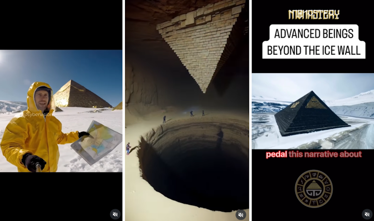 Cenários desérticos, trilhas sonoras místicas e drones sobrevoando estruturas geométricas. Ideias sobre pirâmides secretas ou mesmo sobre cidades subterrâneas alimentadas por uma suposta energia das pirâmides surgem de tempos em tempos e são desmentidas por especialistas. Os vídeos de pirâmides secretas criados por IA simulam descobertas que a “arqueologia oficial” teria escondido da humanidade. Há pirâmides subterrâneas com entradas lacradas e outras que brilham quando “energizadas” por alienígenas. Em muitos casos, há narrações robóticas que falam em “frequências universais”, “linhas de energia planetária” e “sabedoria ancestral reprimida”. O visual impressiona com texturas realistas, vozes pausadas e closes dramáticos.