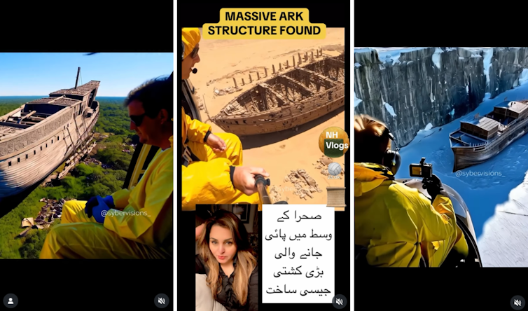 Com frequência, arqueólogos organizam expedições para encontrar o que poderia ser a chamada “Arca de Noé”. Sem sucesso no mundo físico, alguns teóricos da conspiração passaram a imaginar a alternativa no digital. Com estética de documentário, os vídeos que simulam a descoberta da Arca de Noé apresentam uma estrutura gigantesca presa em montanhas, desertos, ou até geleiras. Em outra versão, uma equipe de pesquisa com jalecos e logotipos falsos de universidades explora o interior da embarcação. A IA recria madeira ressecada, instrumentos de medição e até diálogos abafados entre “pesquisadores”. A encenação é perfeita para quem já procura confirmação para crenças religiosas. E para quem não procura, é suficientemente convincente para provocar dúvida.