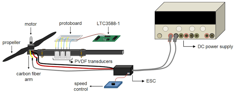 Para enfrentar esse desafio, instalamos três transdutores de PVDF nos braços de drones multirrotores. Conectados em série e ligados a um circuito integrado de gerenciamento de energia, esses módulos foram capazes de aumentar linearmente a potência coletada, mesmo em voos lentos, a cerca de 7,5 metros por segundo. Esse arranjo abre a possibilidade de alimentar sensores que exigem mais energia.